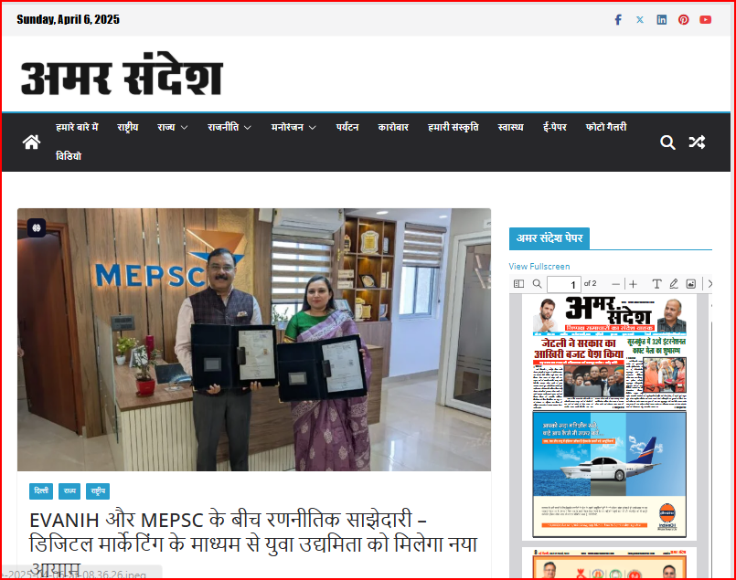 The EVANIH team thanks Amar Sandesh Daily News for featuring our partnership with MEPSC (Management & Entrepreneurship and Professional Skills Council) on April 3rd, 2025!We’re proud to develop short-term Digital Marketing Courses to simplify business for Aspiring Entrepreneurs, aspiring young professionals, and students.Stay tuned as MEPSC (Management & Entrepreneurship and Professional Skills Council) and EVANIH […]