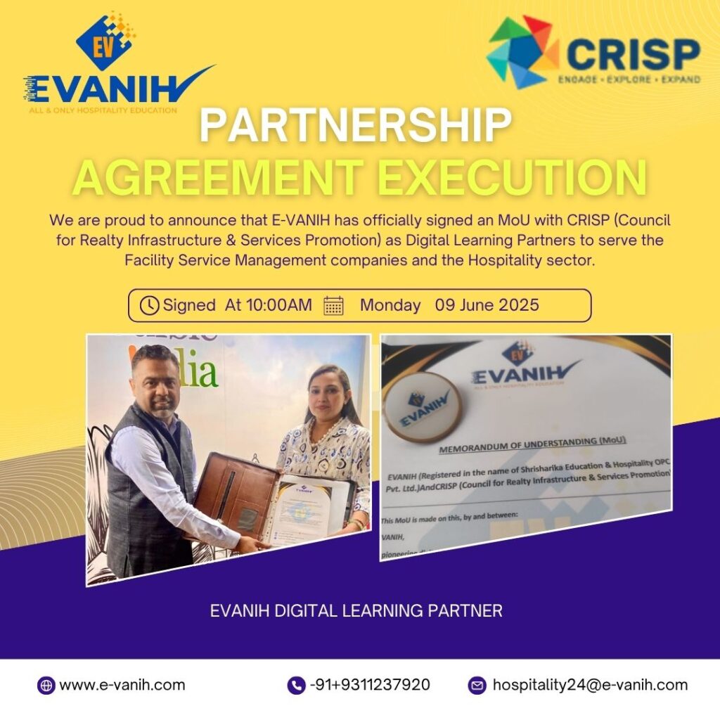 We are proud to announce that EVANIH has officially signed a Memorandum of Understanding (MoU) with the CRISP Council for Realty Infrastructure and Services Promotion as Digital Learning Partners to serve the Facility Service Management companies and the Hospitality sector. This strategic collaboration aims to upskill fresh hospitality graduates and provide learning opportunities for working […]